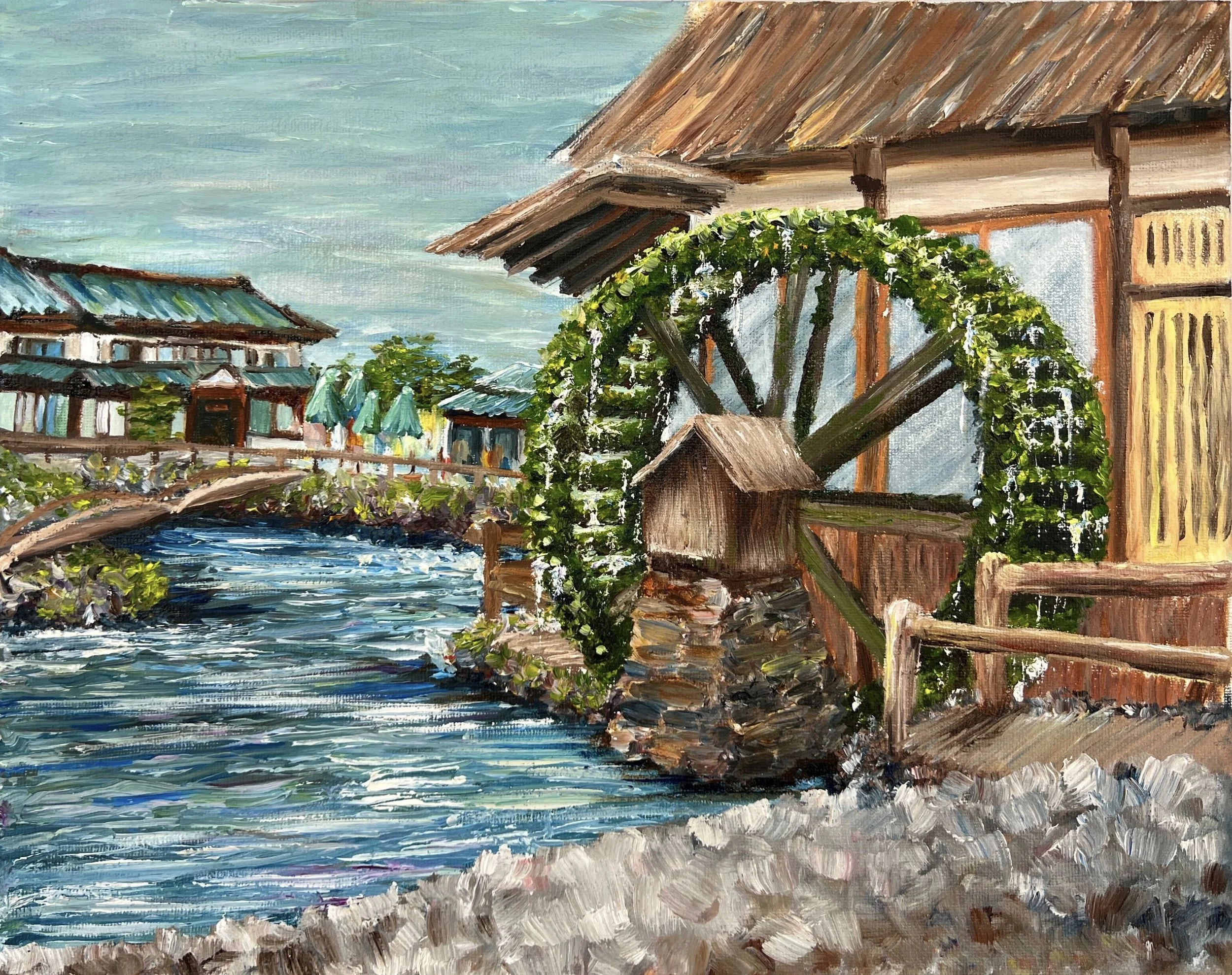 Although I typically work on very smooth surfaces to create hyperreal pieces, I wanted to push into more textural and impressionist styles for this painting. My reference (below) was of an overgrown waterwheel in Oshino Hakkai, a small town near the base of Mt. Fuji. I just loved the speckled moss and drips of water as it rotated slowly. It honestly hurt my brain to work so imprecisely and I was amazed at how much paint I went through so quickly, but I loved playing with colors and I love how I managed to elevate some of the blander colors.
